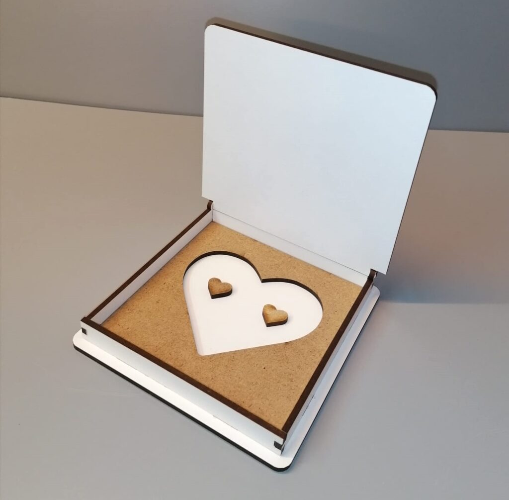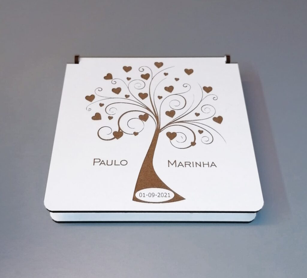 Caixa de casamento ou aniversário de casamento em MDF branco 3mm + MDF cru (castanho) 3mm no interior.