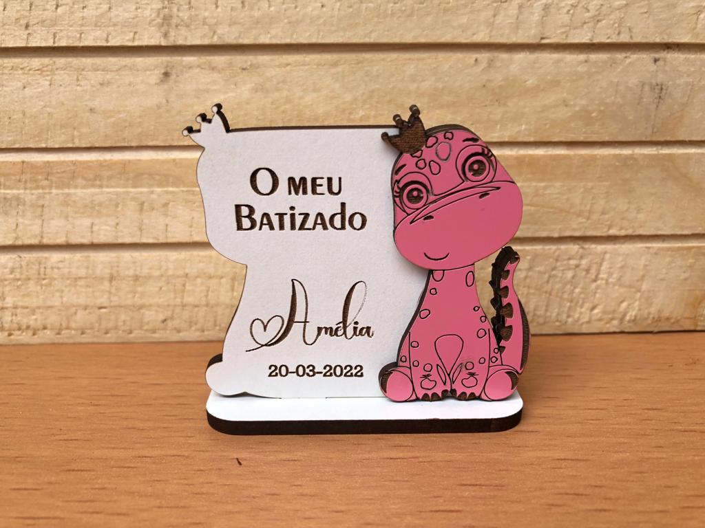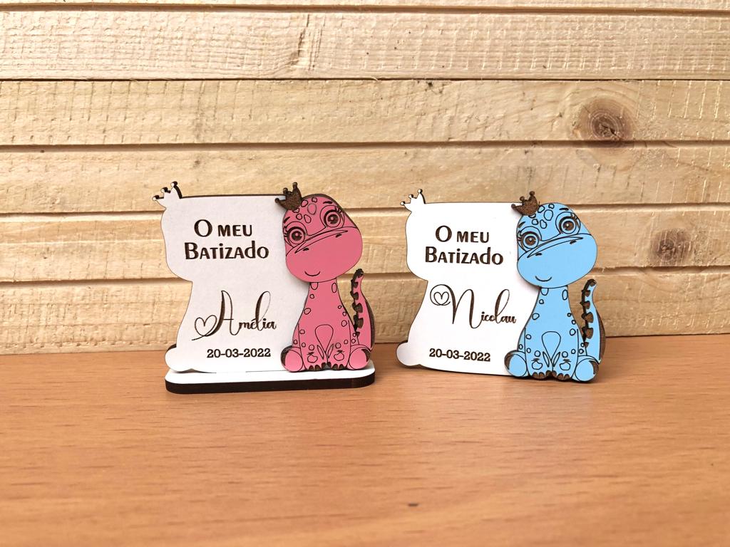 A peça pode ser totalmente personalizada com o nome da criança, a data do evento e o tipo de celebração (por exemplo: “O meu Aniversário”, “O meu Batizado”, etc.). Também é possível escolher a cor do dinossauro entre rosa ou azul, adaptando-se ao estilo da sua festa.